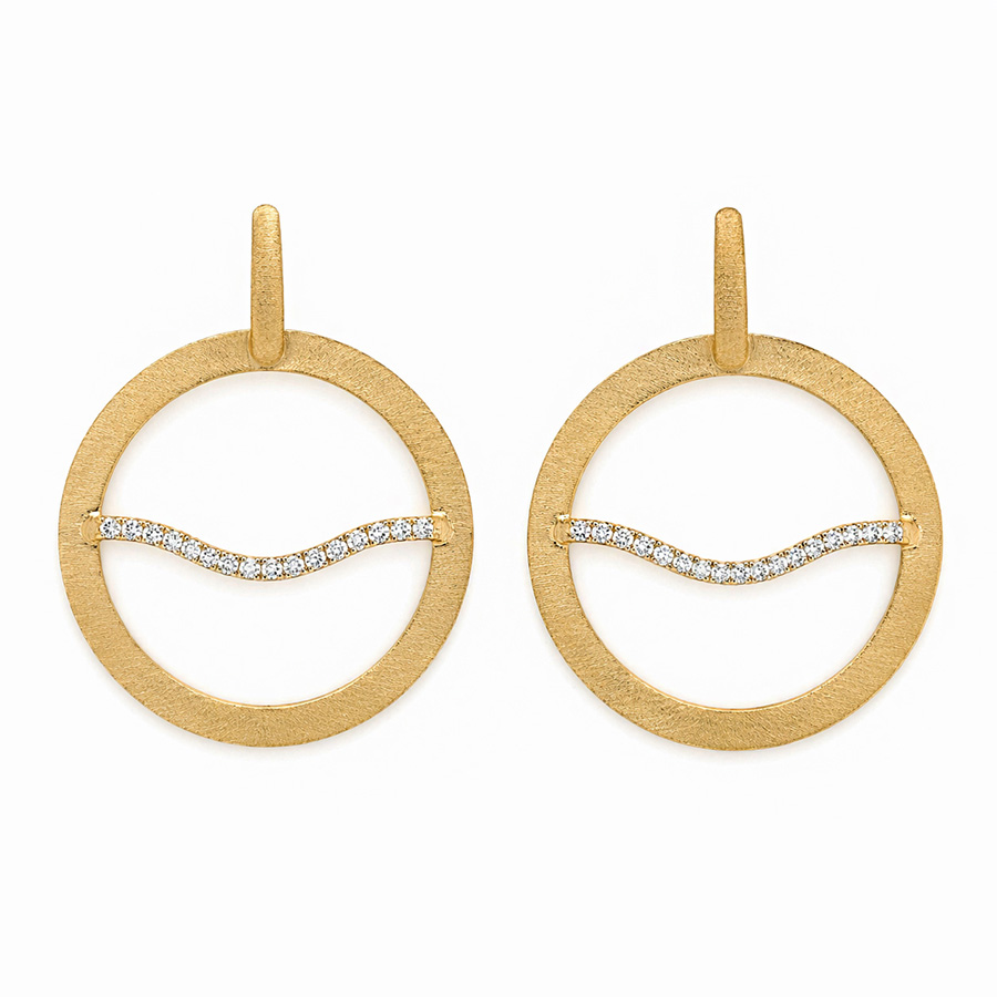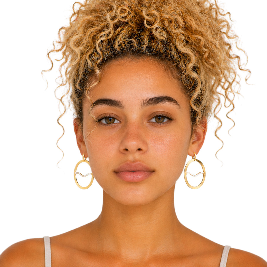Boucles d’Oreilles pour Femme Onda de Ouro Majestosa de marque Donna Si. Boucles d’oreilles de fantaisie confectionnées en laiton dorées or fin 18 carats et de cristaux de Swarovski. Boucles d’oreilles au cercle doré texturé sublimé par une ligne ondulée scintillante. Une version plus audacieuse et sophistiquée, parfaite pour illuminer le visage avec élégance. Fait main au Brésil.