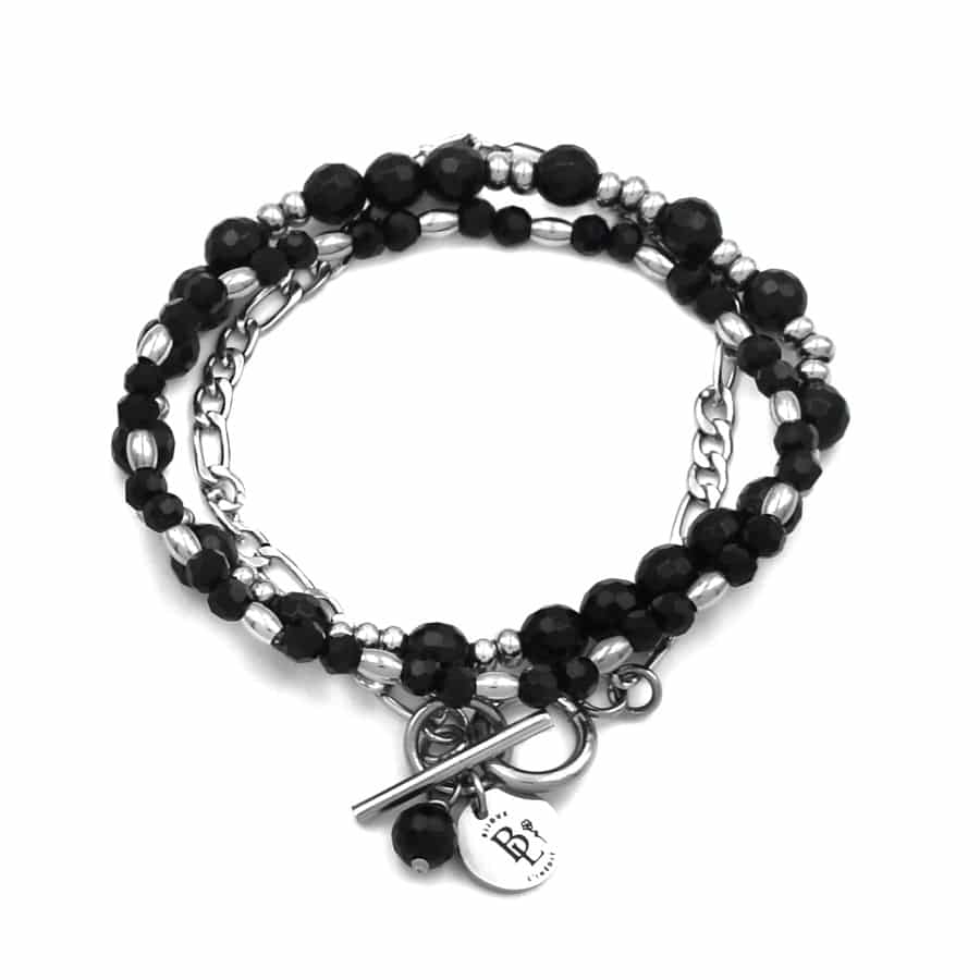 Bracelet pour Femme Aziza de la collection Unika par Jo. Bracelet de fantaisie fait d’acier inox et tourmaline noire. Un trio de bracelets inspiré par les tendances des célébrités, à porter soit individuellement, soit en superposition.. Le bijou fait main est réalisé à notre atelier de Saint-Lambert.