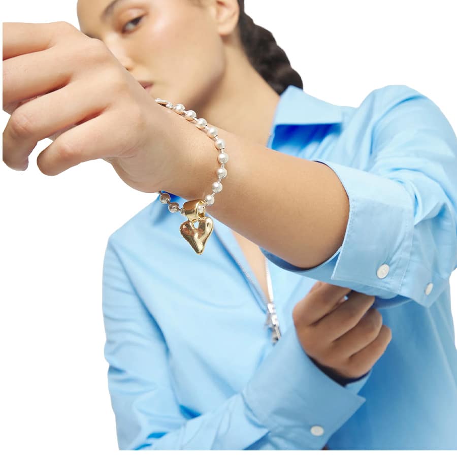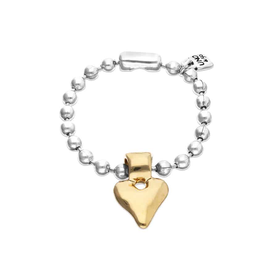 Bracelet pour Femme Bille et Coeur de marque Uno de 50. Bracelet de fantaisie plaqué argent sterling et doré or fin 18 carats . Ce bracelet au style affirmé est composé de billes au caractère distinctif, sublimées par un cœur central. Un bijou lumineux et audacieux, parfait pour ajouter une touche forte, moderne et élégante à votre poignet. Fait main en Espagne.