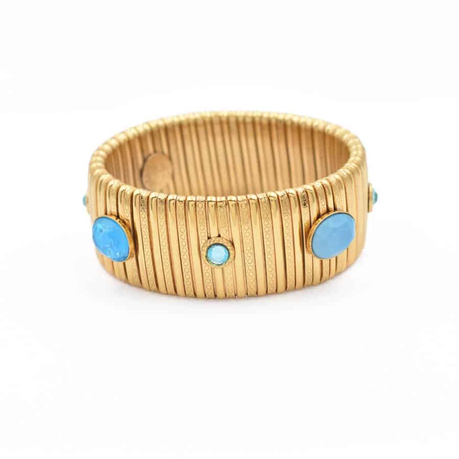 Bracelet pour Femme Strada Doré de marque Gas Bijoux. Bracelet fait de métal doré or fin 24 carats et de pierre de verre bleu. La structure renferme un élastique qui lui permet de s’ajuster légèrement pour le passer. Un bracelet qui capture à la fois la féminité et la modernité, offrant une allure à la fois tendance et intemporelle. Les éléments de la composition des bijoux sont soigneusement sélectionnés puis assemblés à la main dans l’atelier marseillais.