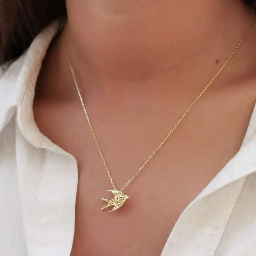 Collier pour Femme Hirondelle Dorée de marque Portugal Jewels. Collier argent sterling doré or fin 19 carats. Élégance et légèreté se rencontrent dans ce collier délicat. Son pendentif en forme d’hirondelle, finement travaillé en filigrane doré, capture la grâce de l’oiseau en plein vol. Un bijou raffiné qui apporte une touche poétique et lumineuse à toutes vos tenues.